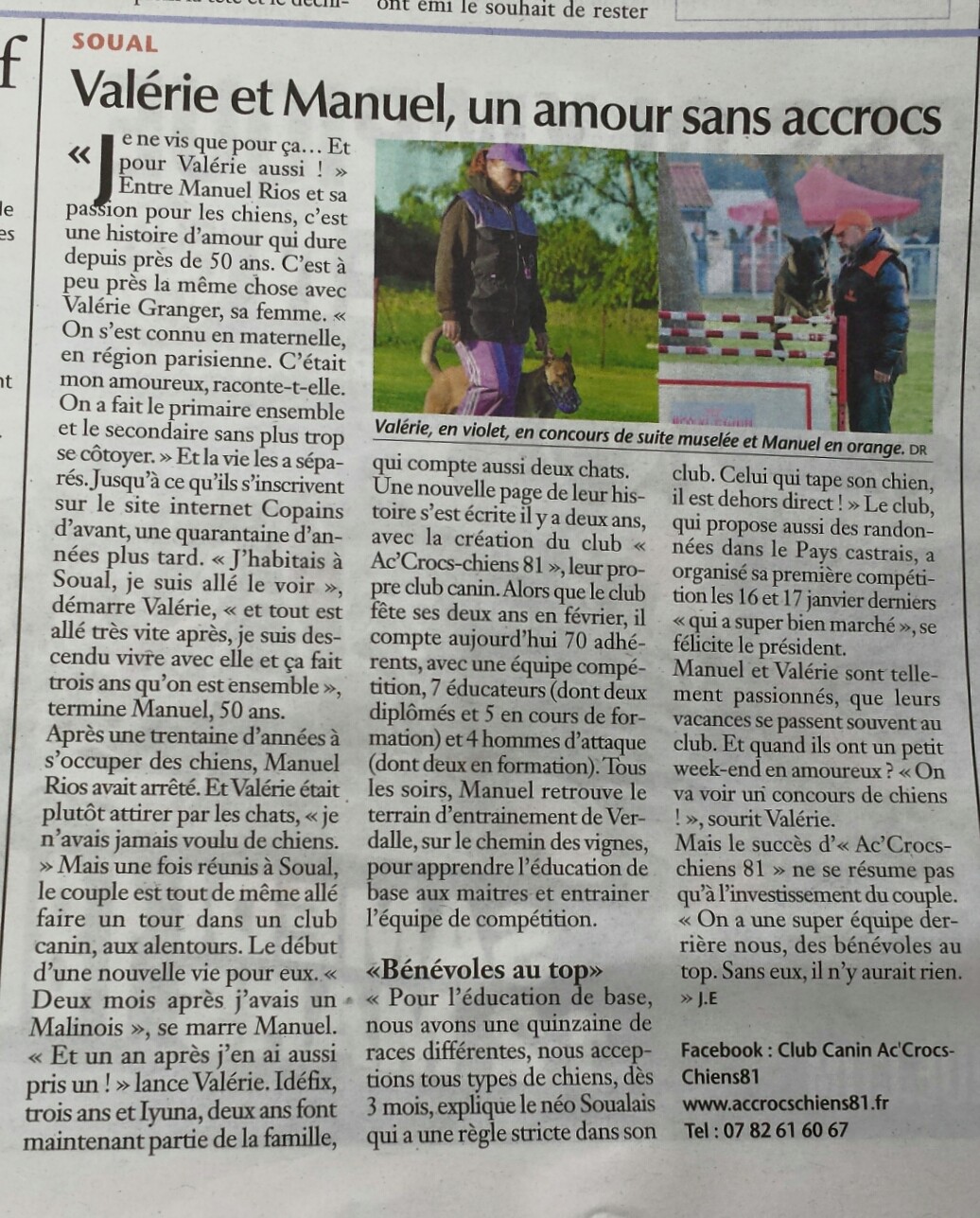 Valérie Granger dit « Valou » a découvert le monde canin depuis sa rencontre avec Manuel, n’ayant jamais eu de chien, mais seulement des chats, elle décide de prendre un Malinois pour se former à la discipline Ring et fait son premier concours en septembre 2015. Ses week-end se déroulent aussi au club canin Ac’Crocs-Chiens 81.
